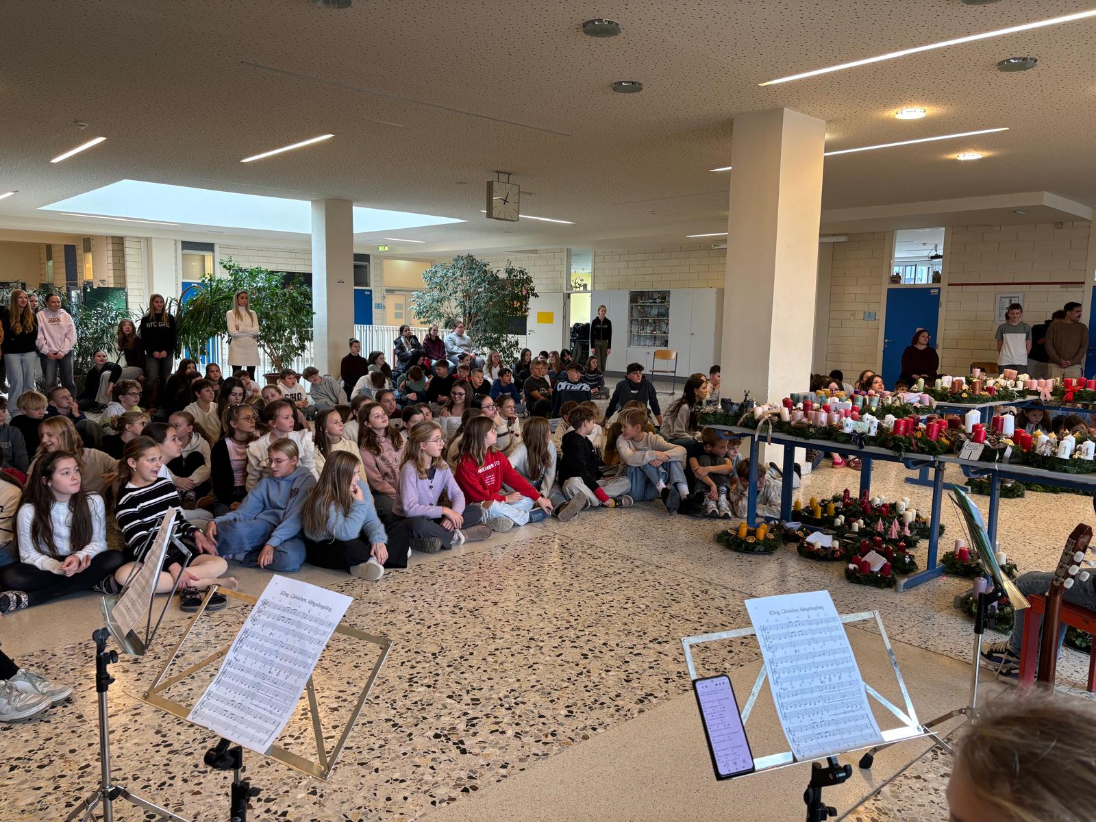 An einem eigens dafür geplanten Projekttag zeigten sich Ober- und Unterstufenschüler sehr kreativ und ideenreich. Im katholischen Religionsunterricht wurden überdies sowohl die Geschichte als auch die Symbolik des Adventkranzes näher behandelt. Am Freitag vor dem ersten Adventwochenende fand dann im Westtrakt unserer Schule eine stimmungsvolle Feier statt, bei der die selbst kreierten Adventkränze gesegnet wurden. Dabei sorgten Schüler auch für eine beeindruckende musikalische Gestaltung.